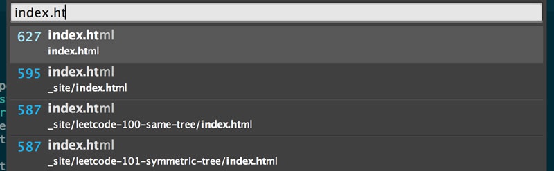 如果你之前用过Coda、Textmate或者Dreamweaver你可能对侧边栏上的文件导航及其依赖。Sublime Text带来了Goto Anything特性,只需要按下简单的 ⌘ (Ctrl on Windows) + P 就可以前往任何你想到达的位置,这是你能想到的打开文件的最快的方法。智能感知的提示框提供了模糊匹配,我们不需要记住准确的文件名,也不需要记住他在哪层文件夹里。