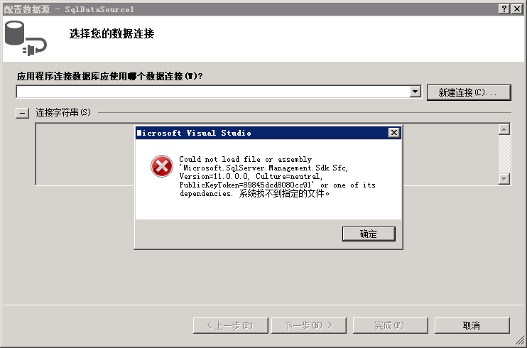 Could not load file or assembly 'Microsoft.SqlServer.Management.Sdk.Sfc, Version=11.0.0.0, Culture=neutral, PublicKeyToken=89845dcd8080cc91' or one of its dependencies. 系统找不到指定的文件。