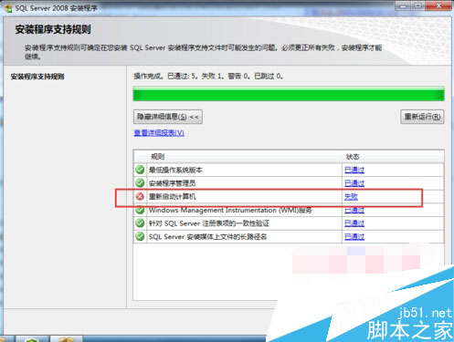 SQL server是微软推出的数据库管理系统,广泛使用于大型多处理器的服务器等多种平台。最近有用户在安装SQL server 2008程序是提示重新启动计算机失败问题(如图),相信很多用户都会选择重启电脑,但再次安装时也依然出现同样错误问题,出现这种现象主要是注册表问题,下来看看具体解决方案吧。