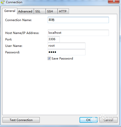 5、完成上面步骤,然后点击左下角有个‘Test Connectiion’如果弹出success,恭喜你直接点击右下角的‘save’按钮就可以了。如果弹出error ,你则需要再重新仔细查看自己哪里填错了。
