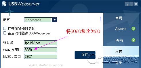 3、由于该工具包默认开启的网站端口为 8080 ,所以我们需要进入“设置”,将Apache端口手动修改为 80 ,点击保存后如果没有生效,请关闭软件重新打开即可解决~