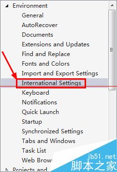 6、选择最左边的环境(environment)下的国际设置(international setting)。