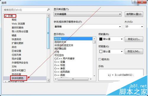4、在选项列表中,选择“环境”->“字体和颜色”。