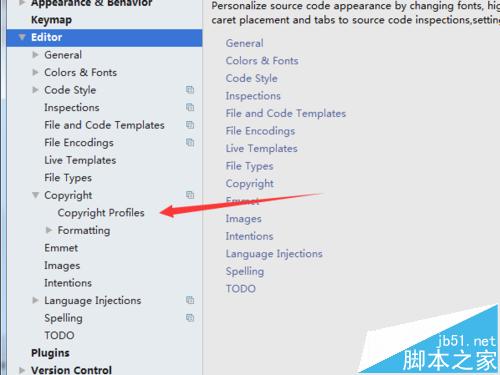 3、进入到editor的中有一项为copyright的选项,点击并张开,并点击copyright profiles的选项。