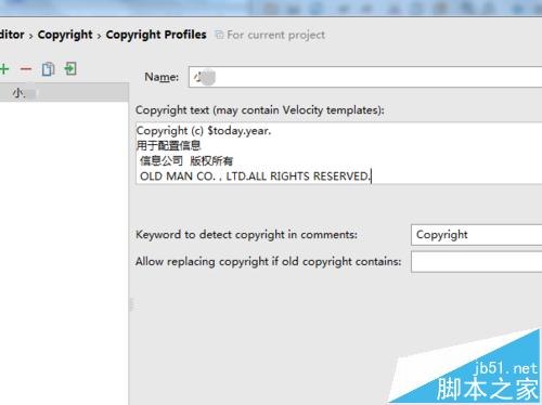 7、返回到Editor的选项的界面中,重新点击copyright的选项,在default project copyright中选中刚才创建的昵称。