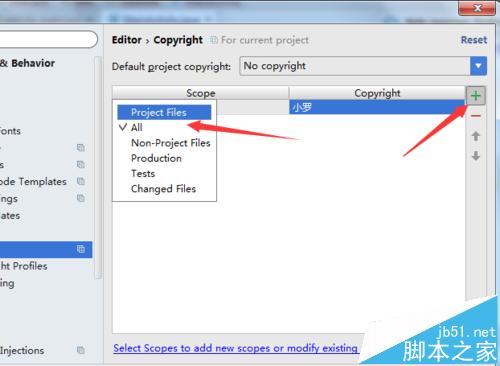 8、在次添加,点击“+”后,弹出的下拉菜单中选择all,copyright中选择刚才的创建文件昵称。