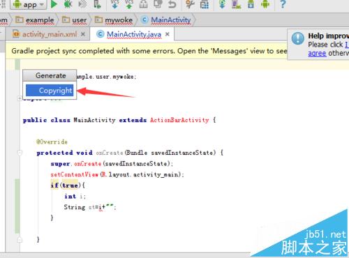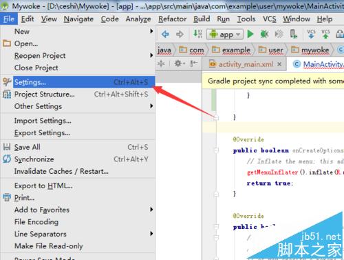 1、首先需要到Android studio中进行配置版权的信息,进入到Android studio的界面中之后,点击菜单中file的弹出的下拉菜单中,选中settings的选项。