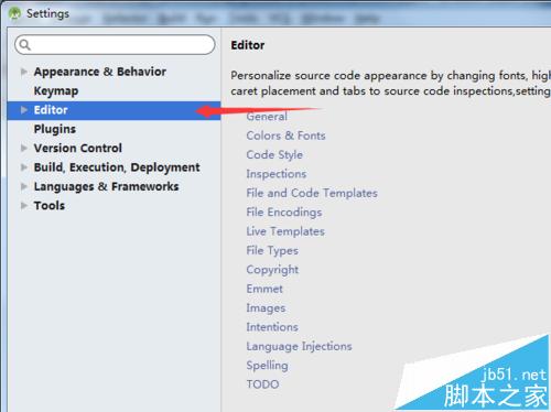 2、进入到settings的设置界面中之后,点击列表的选项中的Editor的选项。