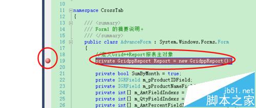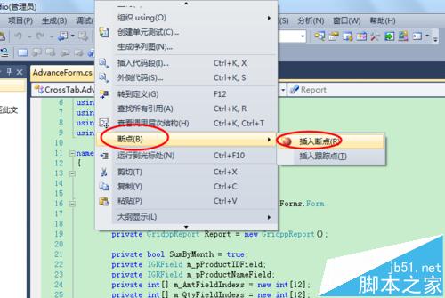 1、用vs2010打开一个程序(此处为CrossTab),将光标定位在要插入断点的地方(此处为CrossTab下的AdvanceForm.cs的第19行处):