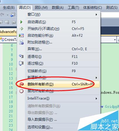 1、可通过第三步中的方法进行断点的切换(即取消),若程序中有多个断点,要取消全部断点,可以在”调试“菜单下看到”删除所有断点“,点击”删除所有断点“(或使用快捷键shift+ctrl+F9)即可将所有断点删除。