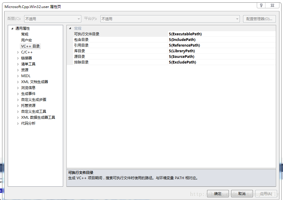 打开 C:\Users\Administrator\AppData\Local\Microsoft\MSBuild\v4.0目录中的 Microsoft.Cpp.Win32.user.props 文件,里面内容一般如下