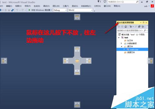 2、在解决方案资源管理器左上角按下鼠标左键不放,往左拖动。