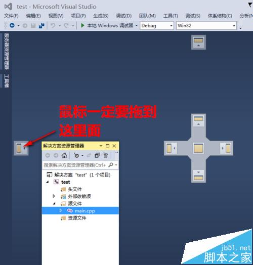 3、这时,要特别留意拖动时自动出现的归位提示框。鼠标一定要拖到提示框内才放手。这时,系统会自动将解决方案资源管理器放到合适的位置。