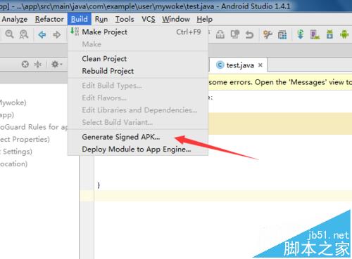 1、对apk的签名需要把项目导入到Android studio软件中,进行点击菜单中“Build”选项,弹出的下拉菜单中的“generate signed APK”.