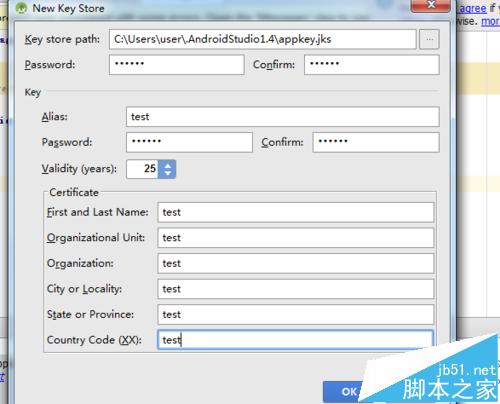 4、进入到new key store的界面中,根据界面中提示信息输入内容信息,输入完成之后点击“ok”。