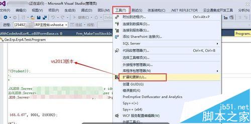 1、在VS2013的菜单栏中,点击【工具->扩展和更新】,如果您用的是VS2010,那么清点击【工具->扩展管理器】按钮