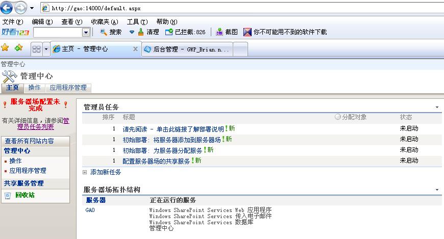 接下来我们利用SharePoint创建第一个Web应用程序。配置完成后会自动跳转到一个网页:http://gao:14000/default.aspx