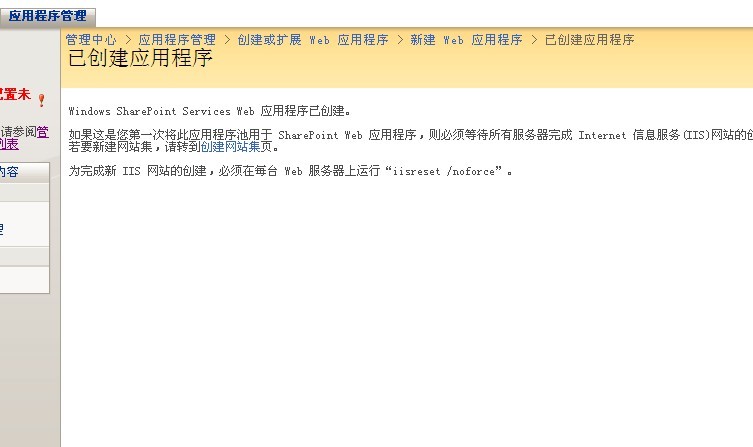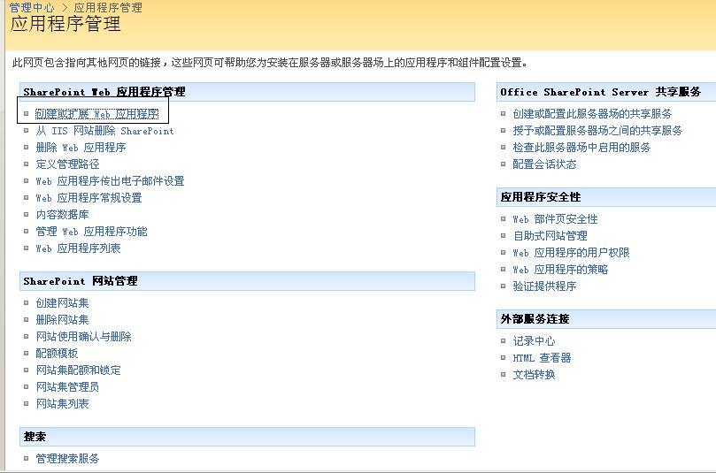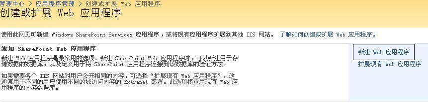 点击“应用程序管理”,选择“创建或扩展Web应用程序”: