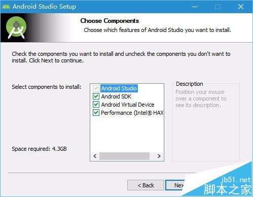 2、勾选安装Android Studio、Android SDK和Android Virtual Device,然后Next下一步。