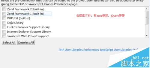 3、择库文件,这里有javascript,jQuery等等,也可以什么都不选,选择好之后点击finish,这是,php项目就创建好了,如图所示;