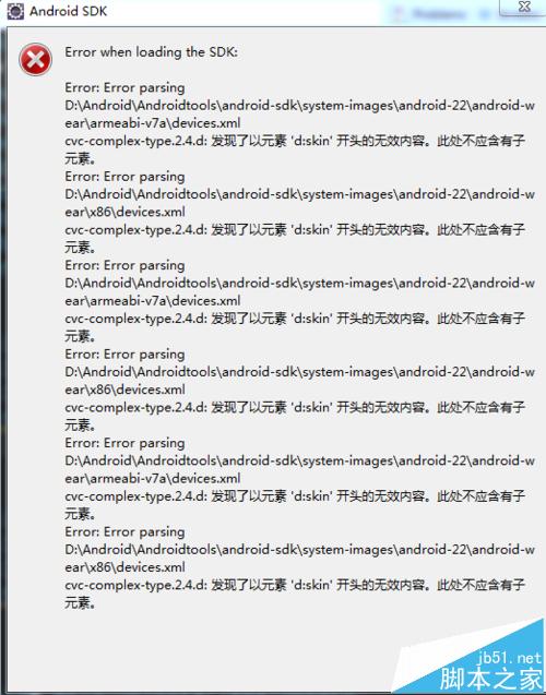 1、进入sdk目录下,把D:\android-sdks\system-images\android-22\android-wear\armeabi- v7a\devices.xml和D:\android-sdks\system-images\android-22\android-wear \x86\devices.xml文件删除