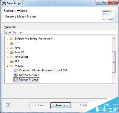 2、在New窗口中选择 Maven -> Maven Project。点击【next】如下图所示: