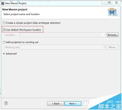 3、根据项目的实际情况选择项目的存放目录,也可以选择【Use default Workspace location】默认工作空间。如下图所示: