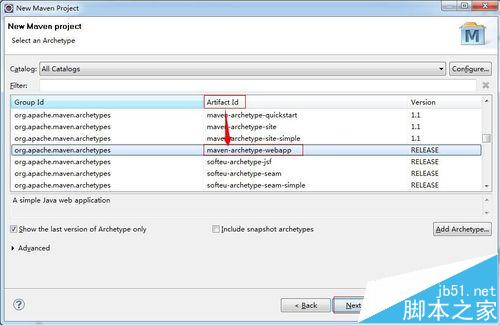 4、在Artifact Id中选择maven-archetype-webapp,如下图所示: