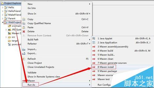 2、将web项目发布到tomca服务器的webapps目录。选中Web项目(或者选中Web项目的pom.xml文件)→【Run As】→【Maven install】,如下图所示: