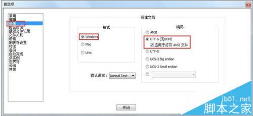 3、选择新建-选择windows-选择UTF-8(无BOM),勾上应用于打开ANSI文件就可以了,如图