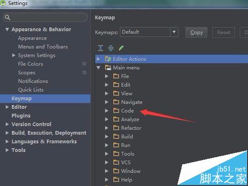 5、进入到了code的选项中之后,在code的列表中找到需要进行更改快捷键的菜单,进行右键该快捷键,弹出了进行选择add keyboard shorttcut的选项。