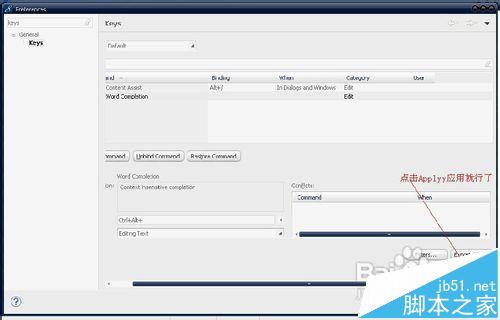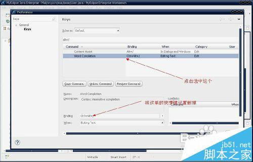 6、在这里我们将第二个去掉,Content Assist就是工具默认的快捷键。直接将wordCompletion删除,先点击wordCompletion,然后将下面的快捷键设置删掉就行了。下面的就是设置如何将冲突的快捷键删除。