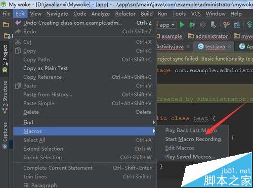 1、进行打开Android studio的工具后,进行点击Android studio菜单中的edit后,就会弹出了一个下拉的菜单中进行选择macros的选项。