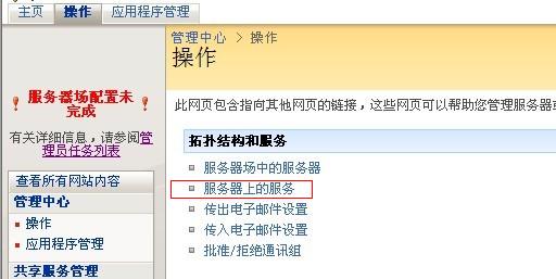 我们进入SharePoint的管理中心,进入操作界面,选择“服务器上的服务”: