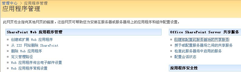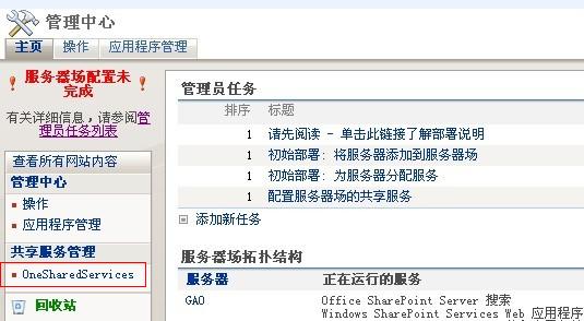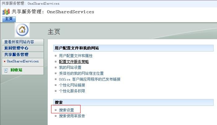然后就是对SharePoint中爬网的设置,进入管理中心,可以看到上面创建的共享服务程序: