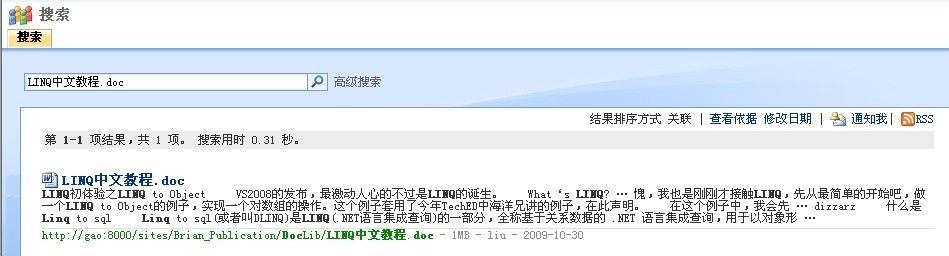 小结:SharePoint为我们提供了方便的数据检索的服务,至于内部的实现手段这里没有做深究,但是从运行的结果上看,关键词的索引,中文的分词,高亮显示等实现的都还是比较OK的,很值得学习,有机会定要好好研究下内部实现的方法!话说微软现在有了Bing,在SharePoint中融入Bing的API也是不错的选择。