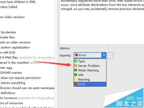 4、在Android lint展开的列表中,可以看到的是有很多的代码的检查项,可以勾选一些需要检查的,在severity中对检查项为error的错误。