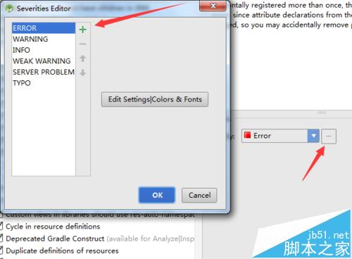 6、也可以进行添加更多,进入到severities Editor,来进行添加错误的等级的分类,在Edit settings|colors&fonts中选择不同颜色。