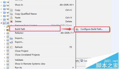 3、找到eclipse config build path功能,找到eclipse项目前面出现红色叹号、eclipse项目前面出现红色感叹号、eclipse项目前面出现红色惊叹号、eclipse工程前面出现红色叹号的项目,鼠标右键,在右键菜单中,依次找到:Build Pathàconfig build path或者Build Pathàconfigure build path。