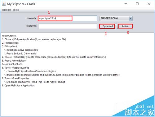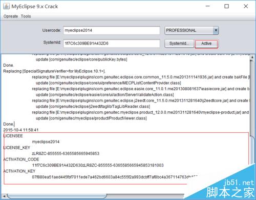 3、在usercode那里随便输入一串字符,点 击SystemId 按钮产生一个 SystemId,再点 Active 按钮。下面的窗口会出现一些东西,如果出现null,则说明你环境变量配置得不对。