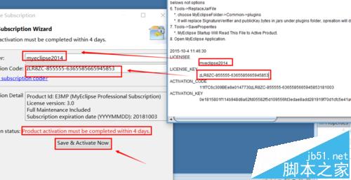 4、打开 MyEclipse,MyEclipse‐-->Subscription Information,把上面生成的,LICENSEE 复制到 Subscripter 中,LICENSE_KEY 复制到 Subscriptioncode 中。点击Save& Activate Now 按钮。