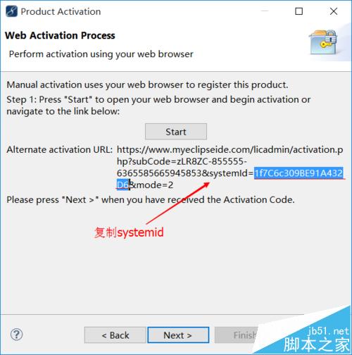 5、在弹出的窗口中,选择 Web activation(connect using your webbroswer),点 Next,产生一个 URL,URL 中有个参数 SystemId,把SystemId复制到破解界面 的 SystemId 中。