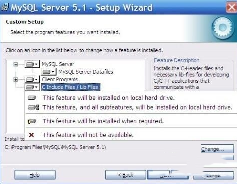 在“Mysql server(MySQL服务器)”上左键单击,选择“This feature, and all subfeatures, will be installed on local hard drive.”,即“此部分,及下属子部分内容,全部安装在本地硬盘上”。点选“Change…”,手动指定安装目录。