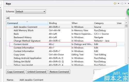 5、进入到了keys的窗口的界面中之后,找到一项为content assits的选项,并选中这个。