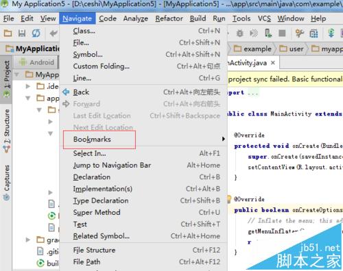 1、在编辑器中已经添加了书签,然后进行点击Android studio中的"navigate"选项菜单。