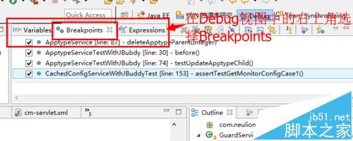 2、成功进入debug界面之后,从右上角找到breakpoint选项(三个选项中的中间一个)。