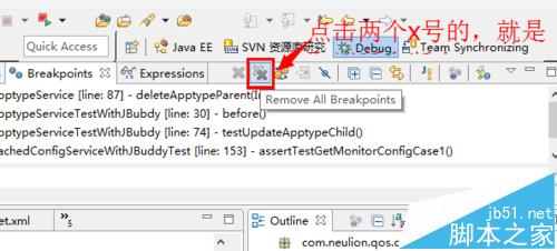 3、会看到一排图标,一个X号的表示取消选择的debug断点,两个X号的是取消所有断点。选择两个X号的,点击。