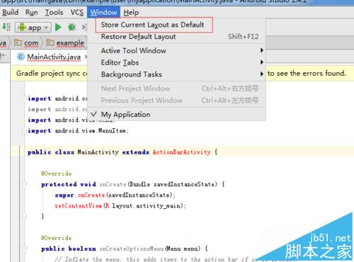3、然后就会弹出了一个下拉菜单中,进行选择为“store current layout as default”的选项。点击完成之后,就会Android studio的布局进行保存。