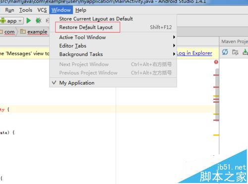 2、默认布局设定完成之后,然后进行Android studio菜单中的“windows”的选项。