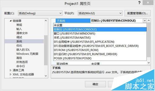 3、系统--->子系统(在窗口右边)--->下拉框选择控制台(/SUBSYSTEM:CONSOLE)